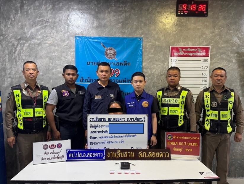 จับกุมข้อหาจำหน่ายยาเสพติด(ยาบ้า) 14/11/2567 โดย admin / ไม่มีหมวดหมู่ วันที่ ๑๔ พ.ย.๖๗ เวลาประมาณ ๐๖.๓๐ น. ภายใต้การอำนวยการของ พ.ต.ท.ถนอมศักดิ์ อินทรบุตร รอง ผกก.สส.สภ.สอยดาว มอบหมายให้ พ.ต.ท.สำเริง ฤทธิเกรียง สว.สส.ฯ พร้อมชุดสืบสวน สภ.สอยดาว ทำการปิดล้อมตรวจค้นเป้าหมาย และจับกุม ข้อหา มียาเสพติดให้โทษฯ(ยาบ้า)โดยมีไว้เพื่อจำหน่ายโดยกระทำเพื่อการค้าฯ และเสพยาเสพติดฯ(ยาบ้า)ฯ จำนวน ๑ ราย ผู้ต้องหา ๑ คน พร้อมด้วยของกลาง ยาบ้า ๕๐ เม็ด สถานที่จับกุม บ้านพักไม่มีเลขที่ หมู่ ๖ ต.ปะตง อ.สอยดาว จ.จันทบุรี นำส่งพนักงานสอบสวน เพื่อดำเนินการตามกฏหมายต่อไป