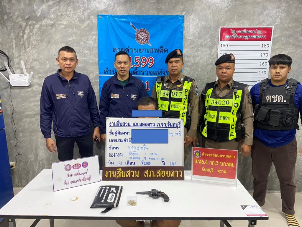 วันที่ ๒๑ มี.ค.๖๘ เวลาประมาณ ๐๖.๐๐ น. ภายใต้การอำนวยการของ พ.ต.ท.สุวิจักขณ์ เรืองนวมดี รอง ผกก.สส.สภ.สอยดาว มอบหมายให้ พ.ต.ท.สำเริง ฤทธิเกรียง สว.สส.ฯพร้อมชุดสืบสวน สภ.สอยดาว ทำปิดล้อมตรวจค้นเป้าหมาย และจับกุมข้อหา มีอาวุธปืนและเครื่องกระสุนปืนไว้ในครอบครองโดยไม่ได้รับอนุญาต จำนวน ๑ ราย ผู้ต้องหา ๑ คน พร้อมด้วยของกลาง (๑).อาวุธปืนลูกโม่ ขนาด .๓๒ จำนวน ๑ กระบอก (๒).เครื่องกระสุนปืน(.๓๒) จำนวน ๘ นัด และประเป๋าหนังสีดำ ๑ ใบ สถานที่จับกุม หมู่ ๕ ต.ทรายขาว อ.สอยดาว จ.จันทบุรี นำส่งพนักงานสอบสวน เพื่อดำเนินการตามกฏหมายต่อไป