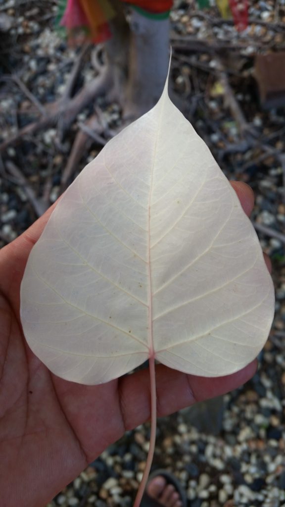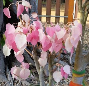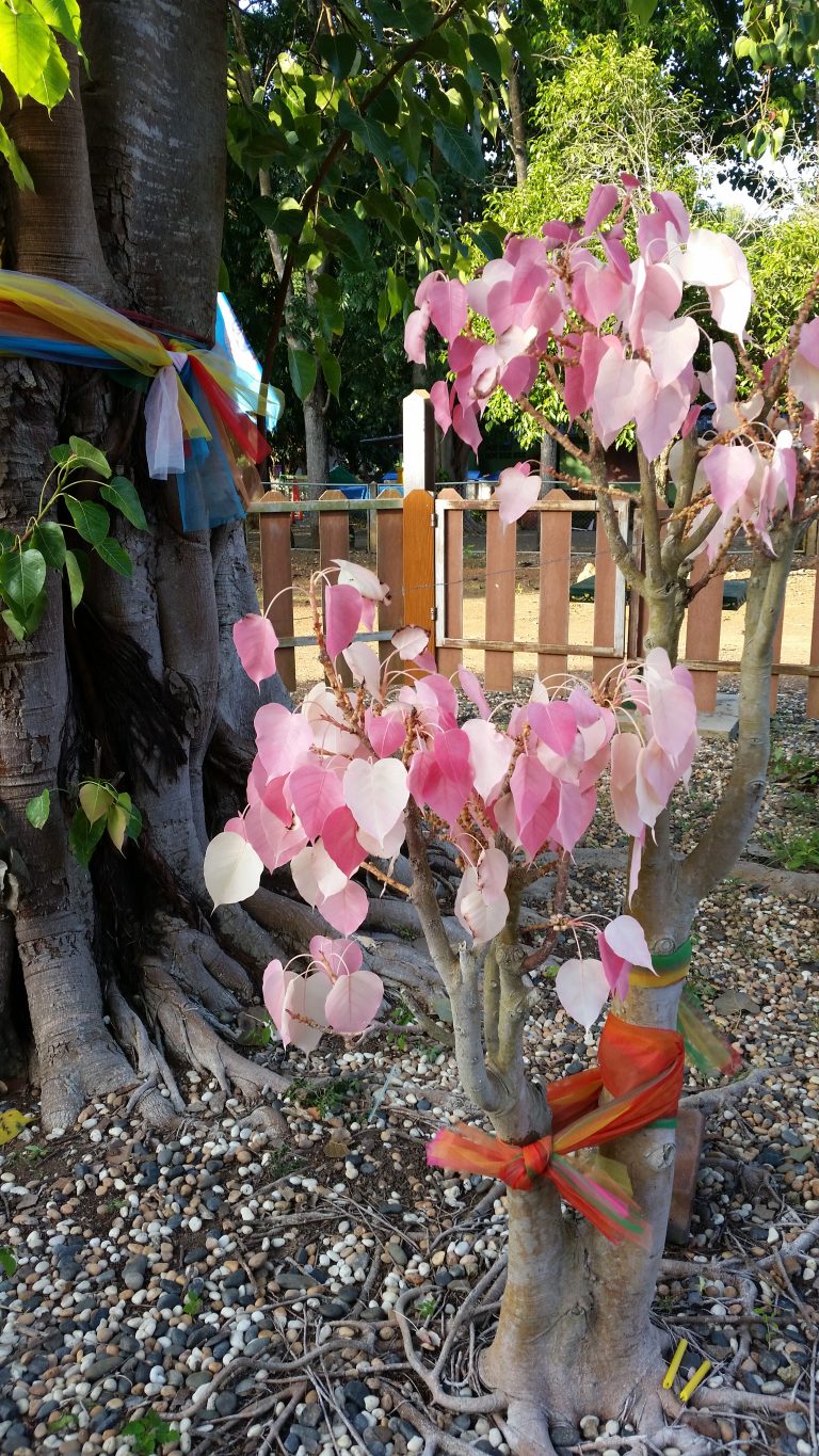 อยู่ที่สำนักสงฆ์วัดใหม่คลองปี บ้านมหาเจรีย์ หมู่ ๗ ต.ทรายขาว อ.สอยดาว จ.จันทบุรี ภายในสำนักสงฆ์จะ มีต้นโพธิ์ใหญ่อายุประมาณ ๒๐ ปี รอบโคนต้นมีรั้วล้อมไว้ และใต้ต้นโพธิ์ใหญ่ มีต้นโพธิ์อีกต้น ขนาดความสูงประมาณ ๑๖๐ ซม. ขึ้นอยู่ ต้นโพธิ์สีชมพูนี้ มีอายุประมาณ ๗ ปี ลำต้นมีความสมบูรณ์ แต่ที่สวยงามแปลกตาคือ มีใบสีชมพูสวยงามทุกใบ ส่วนใบแก่จะกลายเป็นสีขาว ก่อนจะร่วงหล่น แต่ก็จะมีใบอ่อนสีชมพูขึ้นมาใหม่และจะมีใบสีชมพูออกมาเช่นนี้ตลอดทั้งปี โดยเฉพาะช่วงฤดูหนาว จะมีใบสวยงามออกมามากมาย