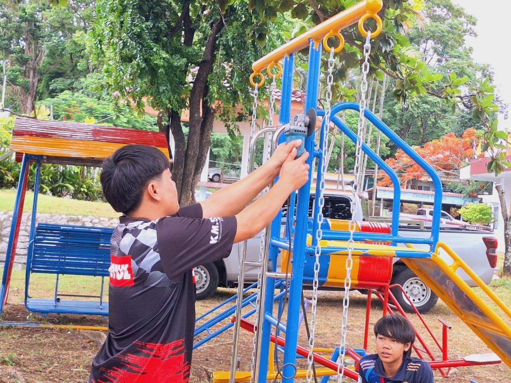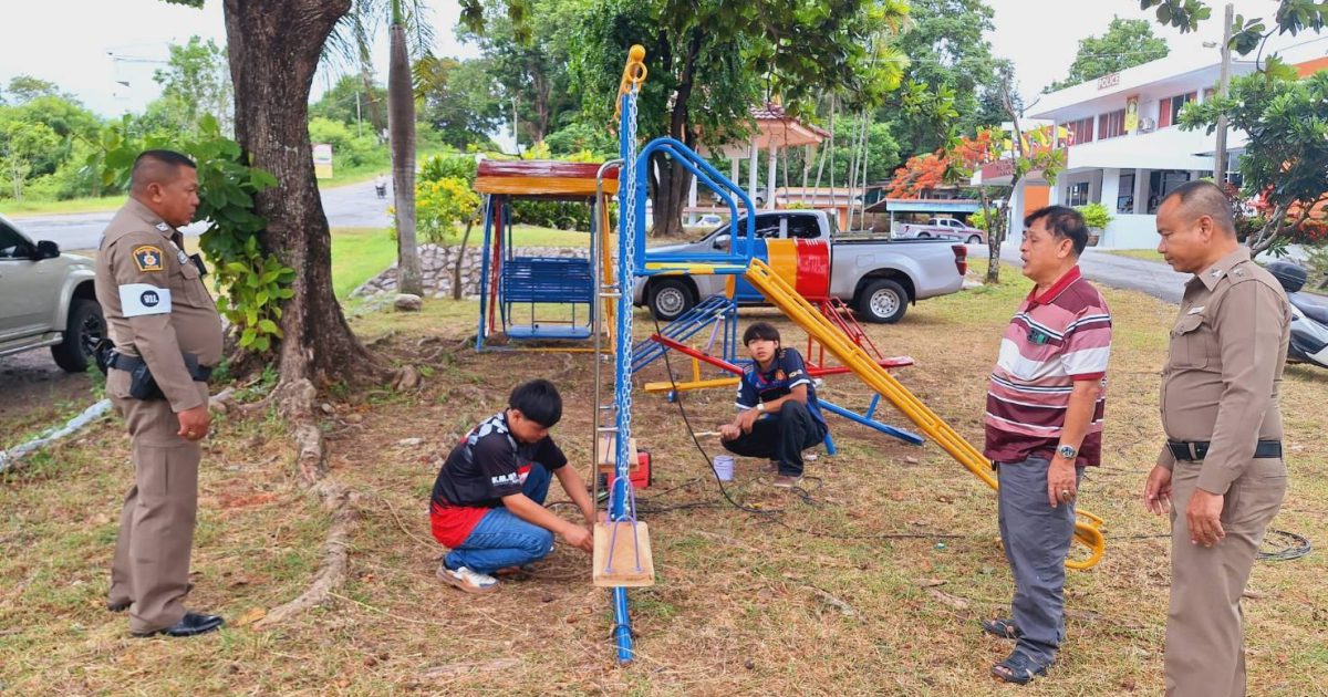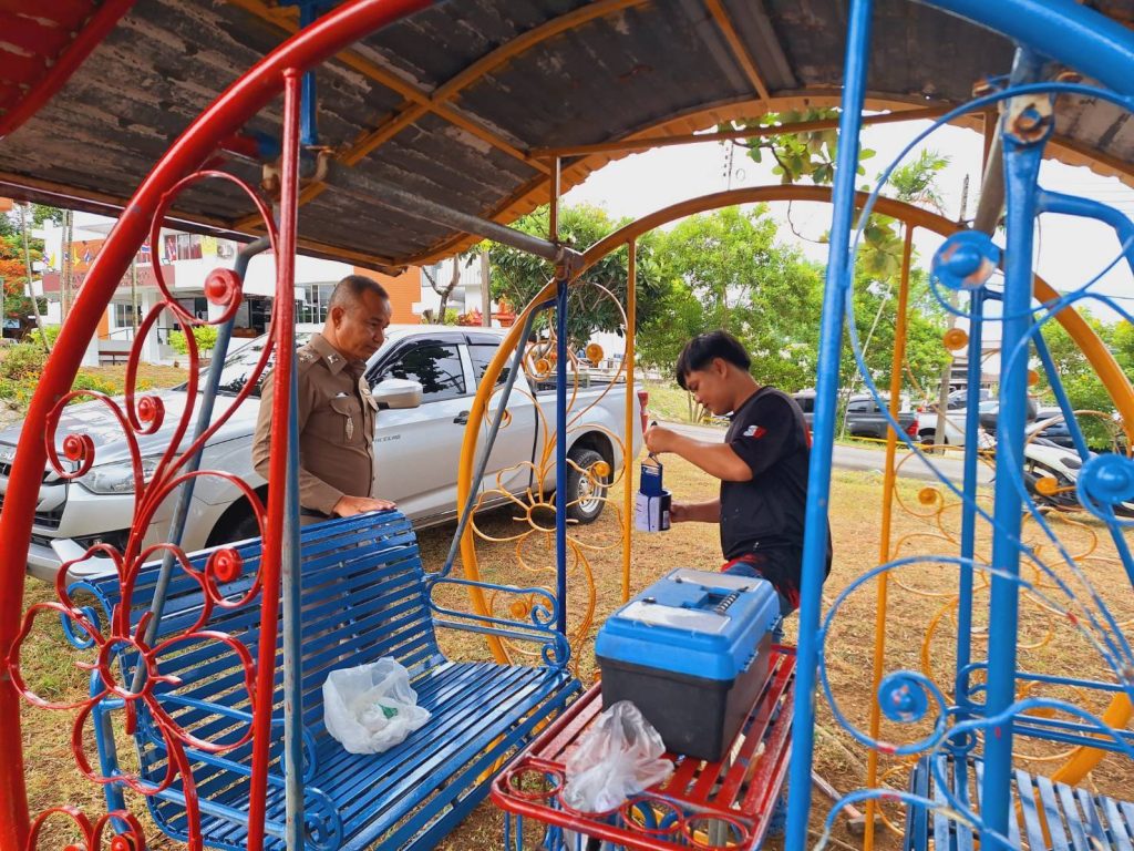 นายสมเกียรติ แซ่จง,นายประชากร ตังแก กต.ตร.สภ.สอยดาว นำช่างมาปรับปรุงเสาชิงช้า 25/06/2567 โดย admin / ไม่มีหมวดหมู่,ข่าวกิจกรรม วันที่ ๒๔ มิ.ย.๖๗ เวลา ๑๕.๐๐ น.นายสมเกียรติ แซ่จง,นายประชากร ตังเก กต.ตร.สภ.สอยดาว ได้นำช่างมาปรับปรุงเสาชิงช้าใหม่ โดยการเชื่อมเหล็กที่ชำรุดและทาสีอุปกรณ์เด็กเล่นเพิ่มเติมจนเสร็จสิ้น เพื่อให้เกิดความมั่นคงแข็งแรงและสวยงาม บริเวณสนามเด็กเล่นหน้า สภ.สอยดาว