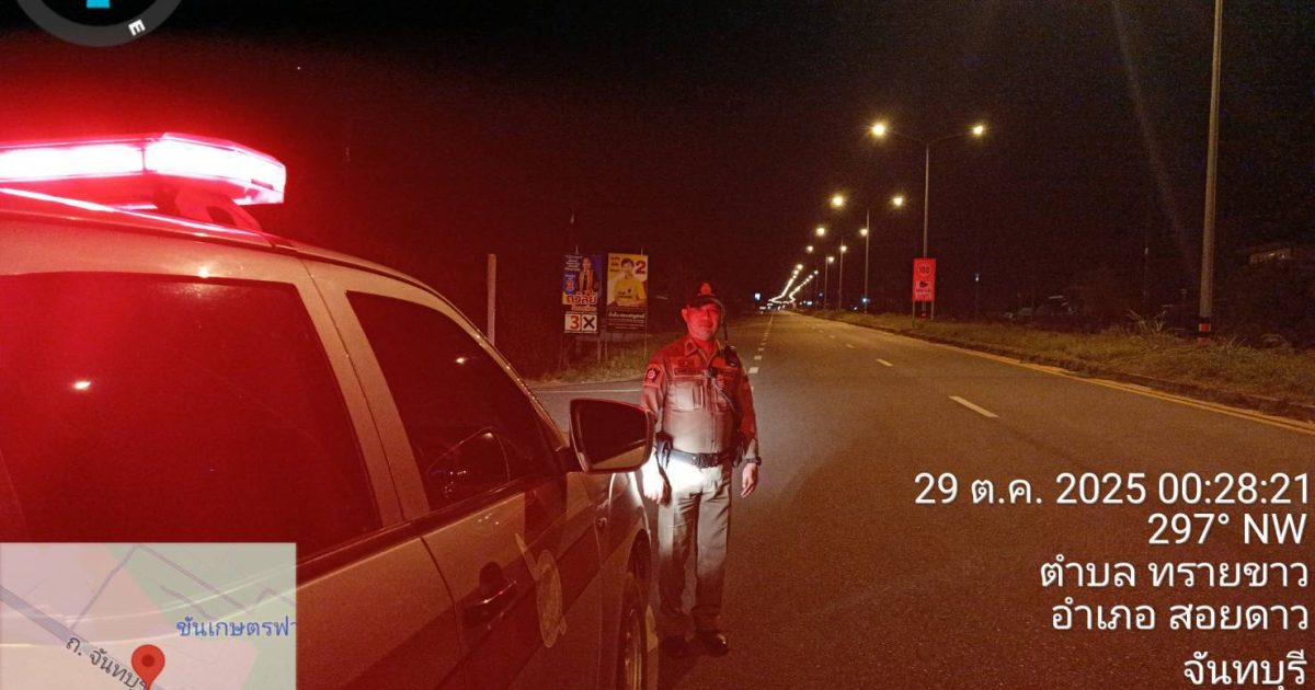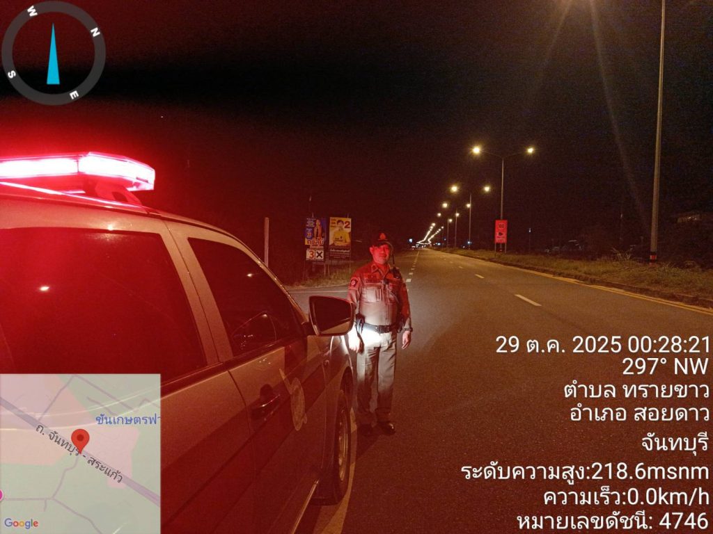 ผลการปฏิบัติสายงานป้องกันปราบปราม เดือน ต.ค.68 29/10/2568 โดย admin / งานป้องกันปราบปราม,งาน ป.เดือน ต.ค.68 วันนี้(๒๙ ต.ค.๖๘) เวลา ๐๐.๒๕ น.ร.ต.ท.วัชรศักดิ์ กระมล รอง สว.(ป.) สภ.สอยดาว ปฏิบัติหน้าที่ดาว ๒๐, พร้อม ร.ต.ต.ธนากร เดชยศดีรอง สว.(ป) สภ.สอยดาว ปฏิบัติหน้าที่สายตรวจรถยนต์ ว.๔ ป้องกันเหตุ แข่งรถในทาง ถนนสาย (๓๑๗)จันทบุรี-สระแก้ว บริเวณแยกซอยบ้านนากะชาย ต.ทรายขาว อ.สอยดาว จว.จันทบุรี เหตุการณ์ทั่วไปปกติ