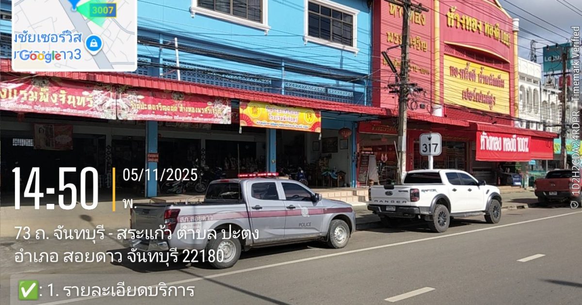 ผลการปฏิบัติสายงานป้องกันปราบปราม เดือน พ.ย.68 06/11/2568 โดย admin / งานป้องกันปราบปราม,งาน ป.เดือน พ.ย.68 วัันที่ ๕ พ.ย.๖๘ เวลา ๑๔.๕๐ น.ว่าที่ ร.ต.อ.สมพิศ โชคเจริญวุฒิกุล รอง สว.(ป) สภ.สอยดาว ปฏิบัติหน้าที่ ๒๐,ด.ต.ประดิษฐ์ พลยางนอก ผบ.หมู่(ป) สภ.สอยดาว ปฏิบัติหน้าที่สายตรวจรถยนต์ ออกตรวจจุดเสี่ยงจุดล่อแหลม ร้านทองทองดี ๑๐๐%ในเขตพื้นที่รับผิดชอบ เหตุการณ์ทั่วไปปกติ