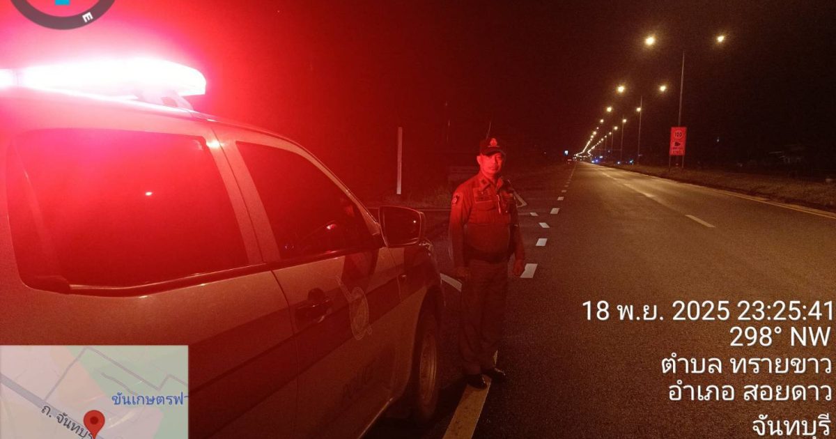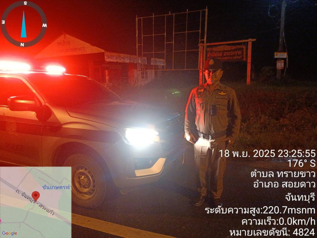 ผลการปฏิบัติสายงานป้องกันปราบปราม เดือน พ.ย.68 19/11/2568 โดย admin / งานป้องกันปราบปราม,งาน ป.เดือน พ.ย.68 วันที่ ๑๘ พ.ย.๖๘ เวลา ๒๓.๒๗ น. ร.ต.ท.วัชรศักดิ์ กระมล รอง สว.(ป.) สภ.สอยดาว,ร.ต.ต.ธนากร เดชยศดี รอง สว.(ป.) สภ.สอยดาว ว.๔ ป้องกันเหตุ แข่งรถในทางถนนสาย(๓๑๗)จันทบุรี-สระแก้ว บริเวณแยกซอยบ้านนากะชาย เหตุการณ์ทั่วไปปกติ