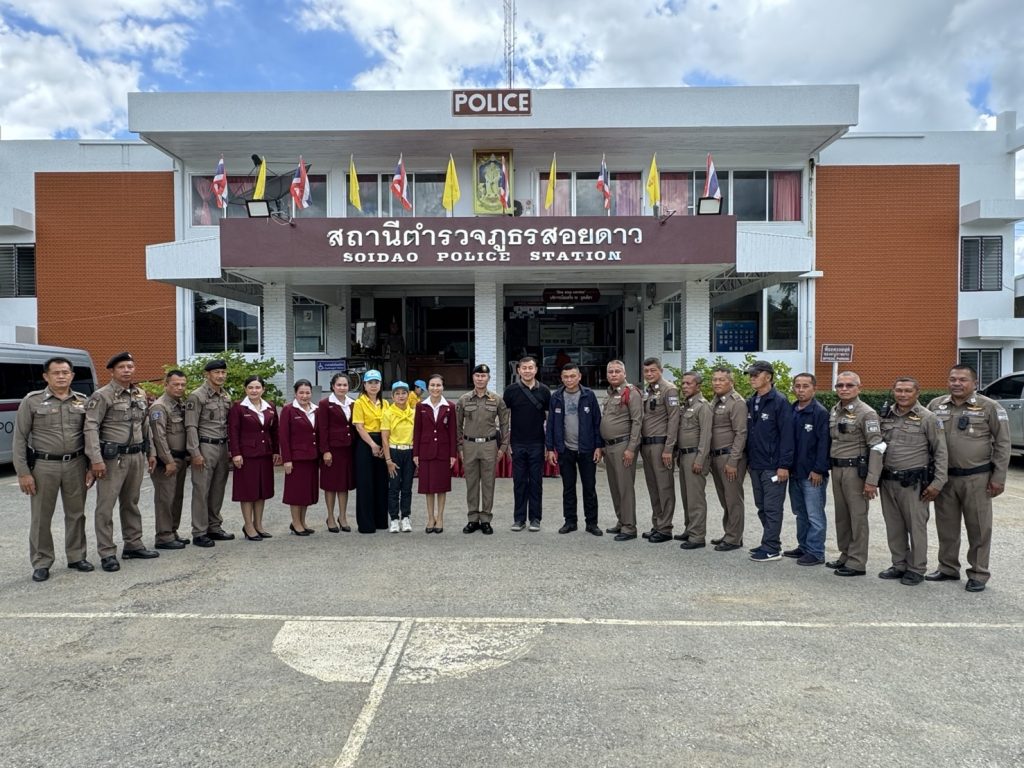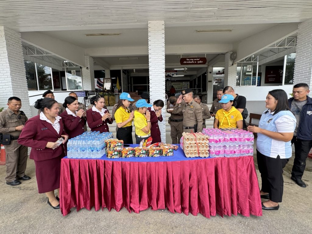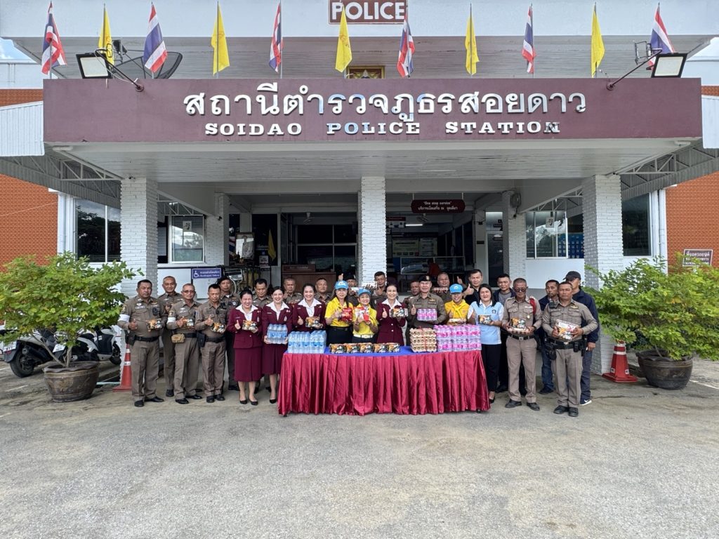 รับมอบสิ่งของจาก คุณทัชยา รักษาสุข ประธานแม่บ้าน ภ.จว.จันทบุรี 22/08/2567 โดย admin / ไม่มีหมวดหมู่,ข่าวกิจกรรม วันนี้(๒๒ ส.ค.๖๗) เวลา ๑๑.๓๐ น.คุณทัชยา รักษาสุข ประธานแม่บ้าน ภ.จว.จันทบุรี และคณะแม่บ้าน ได้เดินทางมามอบสิ่งของเพื่อเป็นขวัญและกำลังใจให้แก่ข้าราชการตำรวจสอยดาว โดยมี พ.ต.อ.ไพทูรย์ ปาปะคัง ผกก.สภ.สอยดาว พร้อมข้าราชการตำรวจสอยดาว ให้การต้อนรับ