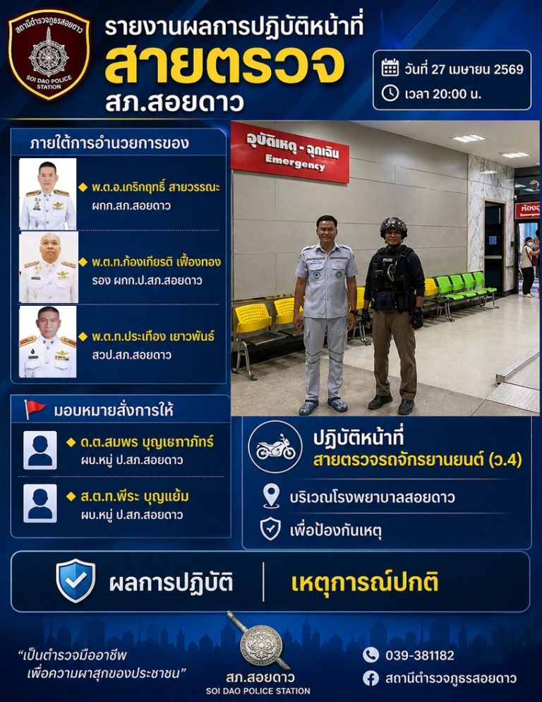 สายตรวจรถจักรยานยนต์ ออกตรวจป้องกันเหตุโรงพยาบาลสอยดาว 27/04/2569 โดย admin / ข่าวประชาสัมพันธ์,งานป้องกันปราบปราม,งาน ป.เดือน เม.ย.69 📅 วันที่ ๒๗ เมษายน ๒๕๖๙⏰ เวลา ๒๐.๐๐ น.◽️ ภายใต้การอำนวยการของ♦️ พ.ต.อ.เกริกฤทธิ์ สายวรรณะ ผกก.สภ.สอยดาว♦️ พ.ต.ท.ก้องเกียรติ เฟื้องทอง รอง ผกก.ป.สภ.สอยดาว♦️ พ.ต.ท.ประเทือง เยาวพันธ์ สวป.สภ.สอยดาว🚩 ได้มอบหมายสั่งการให้♦️ ด.ต.สมพร บุญญรภาภัทร์ ผบ.หมู่ ป.สภ.สอยดาว♦️ ส.ต.ท.พีระ บุญแย้ม ผบ.หมู่ ป.สภ.สอยดาว🚓 ปฏิบัติหน้าที่สายตรวจรถจักรยานยนต์ (ว.๔)📍 บริเวณโรงพยาบาลสอยดาว➡️ เพื่อป้องกันเหตุ🔹 ผลการปฏิบัติ : เหตุการณ์ปกติ
