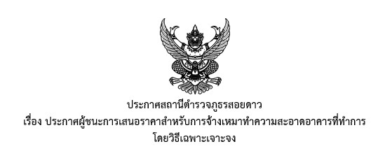 ประกาศสถานีตำรวจภูธรสอยดาว เรื่อง ประกาศผู้ชนะการเสนอราคาสำหรับการจ้างเหมาทำความสะอาดอาคารที่ทำการ โดยวิธีเฉพาะเจาะจง 03/03/2568 โดย admin
