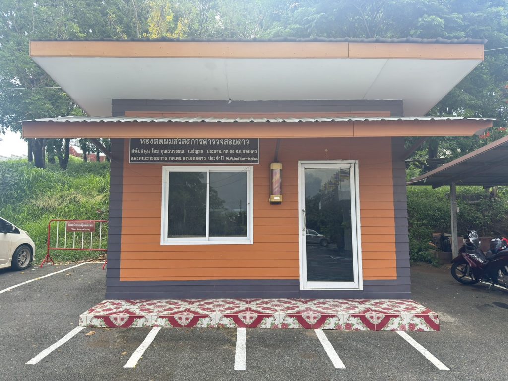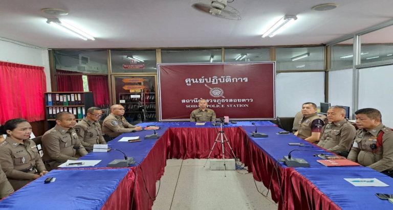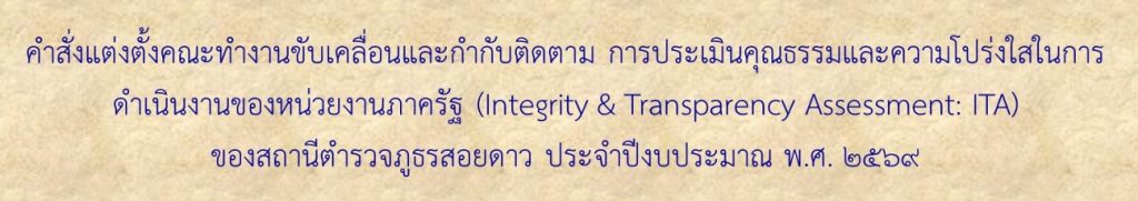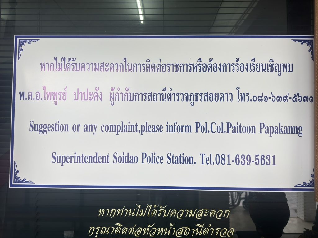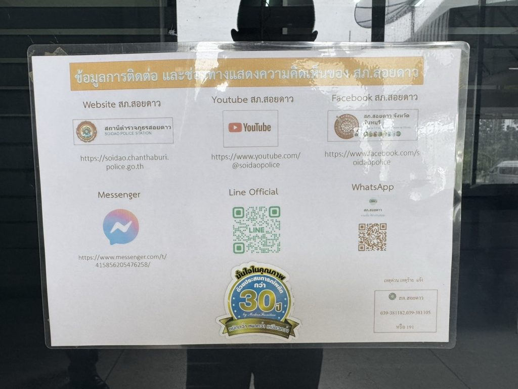 – ป้ายประชาสัมพันธ์ ช่องทางการติดต่อสถานีตำรวจภูธรสอยดาวทางสื่อโซเชียลต่างๆ